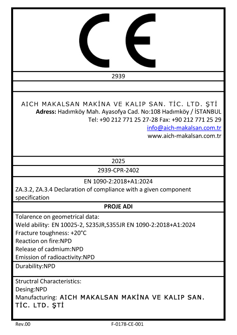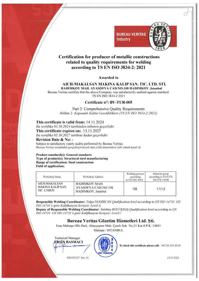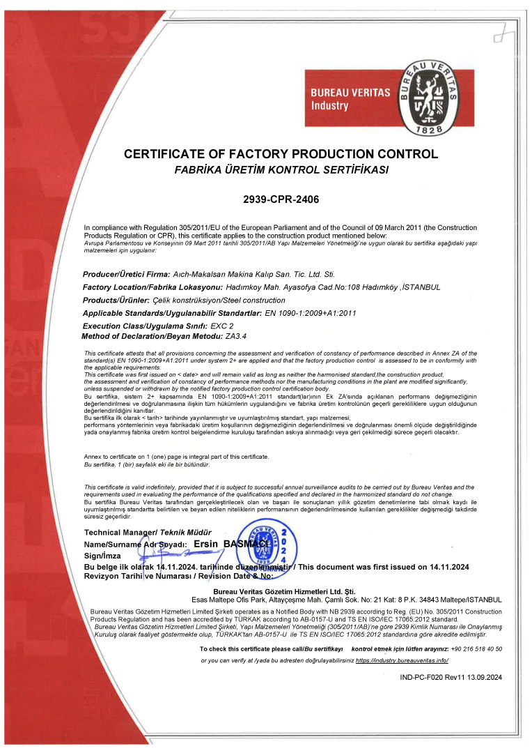 Üretim faaliyetlerimiz, yapısal çelik imalatına yönelik uluslararası kalite gereklilikleri doğrultusunda, TS EN 1090-1:2009+A1:2011 ve TS EN ISO 3834-2:2021 standartlarına tam uyum sağlayacak şekilde planlanmakta ve kontrol edilmektedir. Tüm kaynaklı imalat süreçleri, EN ISO 9606-1:2017 sertifikalı uzman kaynak personelimiz ve deneyimli kalite kontrol ekibimiz tarafından titizlikle yürütülür; malzeme kabulünden nihai sevkiyata kadar her aşama izlenebilirlik, dokümantasyon ve kalite güvence prosedürleri kapsamında yönetilir. Bu sistematik yaklaşım sayesinde projelerimizde yüksek dayanım, güvenilirlik ve sürdürülebilir performans standartları güvence altına alınır.